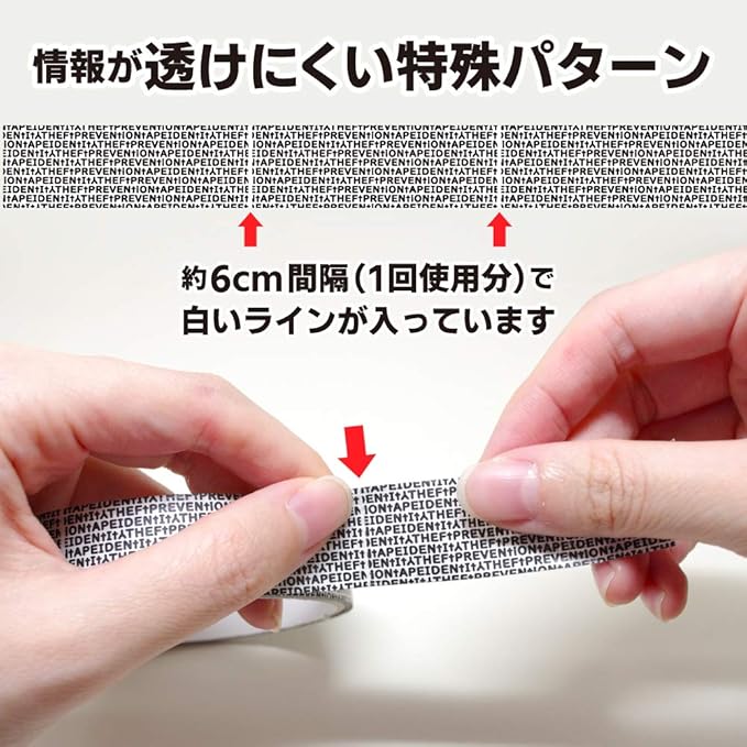 情報が透けにくい特殊パターンのテープなので「貼って 隠して そのまま捨てられる!」