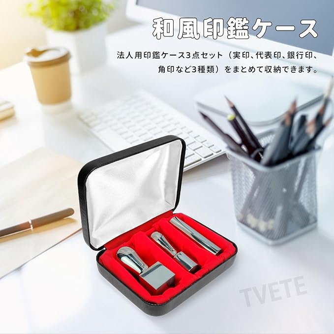 【ビジネス信頼感を高めるおしゃれデザイン】実印・銀行印・角印の3本を一括収納できる法人用はんこケースで、ボロボロの袋やむき出し状態を解消し、会社用としてビジネスシーンを格上げします。