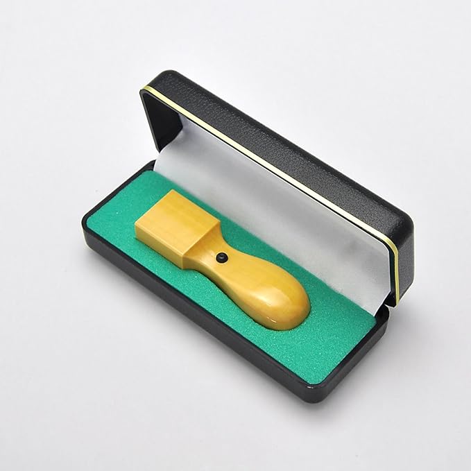 ハンコを引き立たせる高級感溢れるケースです。 緑色のスポンジ部分とハンコのフィット感が抜群です。 W84mm D38mm H25mm。 18ミリ角天丸用です。