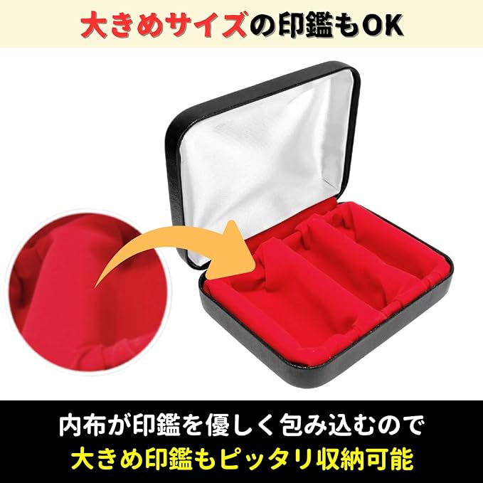 【大きめサイズの印鑑もOK】ゆったりとした幅広設計で、大きめの印鑑もスムーズに収納できます。ケース内部の布が印鑑を優しく包み込むので、持ち運び中に印鑑が中で動いてしまう心配もありません。