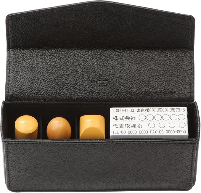 【収納力について】法人用印鑑3本とゴム印をまとめて収納できます。さらに、仕切りに余裕を持たせているので、個人印鑑や認印、印鑑カードや銀行カードなども一緒に入れることができ、契約時に必要な印鑑類をまとめて持ち運びできます。また、コンパクトなサイズでカバンに入れやすいのもポイント。薄型のビジネスバッグにもスッキリ入れられます。ボタンはマグネットタイプで、開け閉めも簡単です。