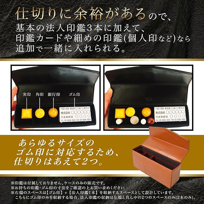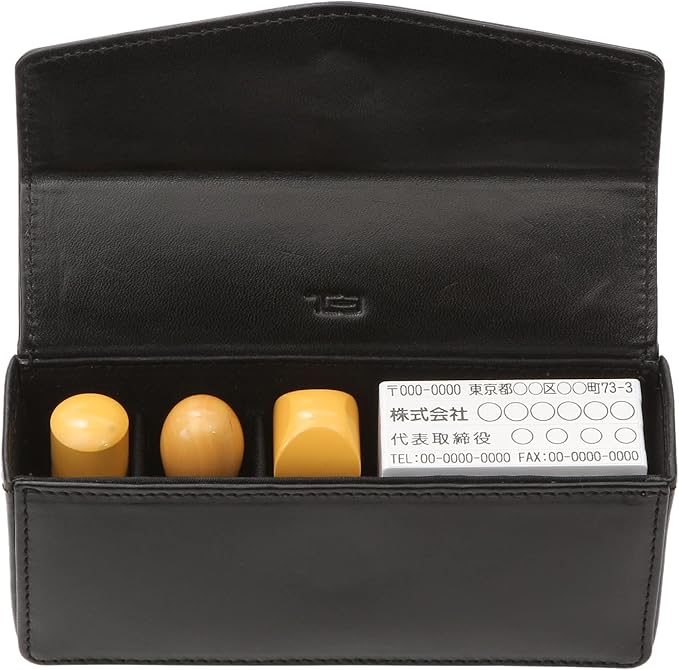 【収納力について】法人印鑑3本とゴム印をまとめて収納できます。さらに、仕切りに余裕を持たせているので、個人印鑑や認印、印鑑カードや銀行カードなども一緒に入れることができ、契約時に必要な印鑑類をまとめて持ち運びできます。また、コンパクトなサイズでカバンに入れやすいのもポイント。訪問先にもある朱肉や印鑑マットなどはあえて持ち歩かない必要最低限の収納で、薄型のビジネスバッグにもスッキリ入れられます。ボタンはマグネットタイプで、開け閉めも簡単です。