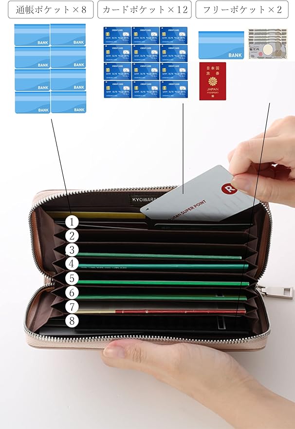✅【見た目以上の収納力】通帳ポケットが8枚、カードポケットが12枚、お札などを入れるポケットが2つとこのサイズでこの収納力はクラス最高です。