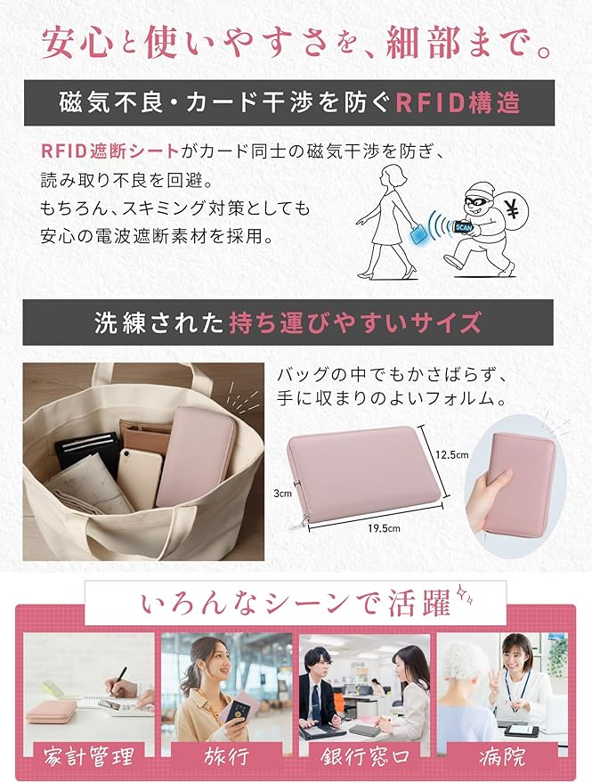 ✅【ATMでの「磁気不良」トラブルを回避】 専門機関の実証実験により効果を確認された高性能RFIDブロッキング素材を内蔵 。大切な通帳・カードの磁気データをガードします。窓口での再発行手続きや、ATMエラーのトラブルを回避します。
