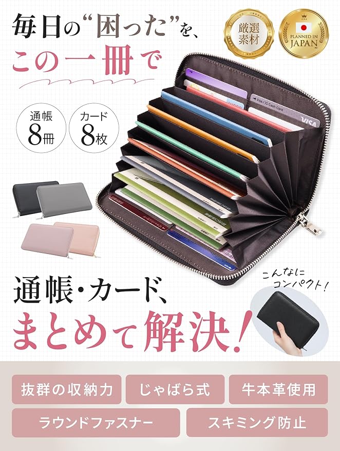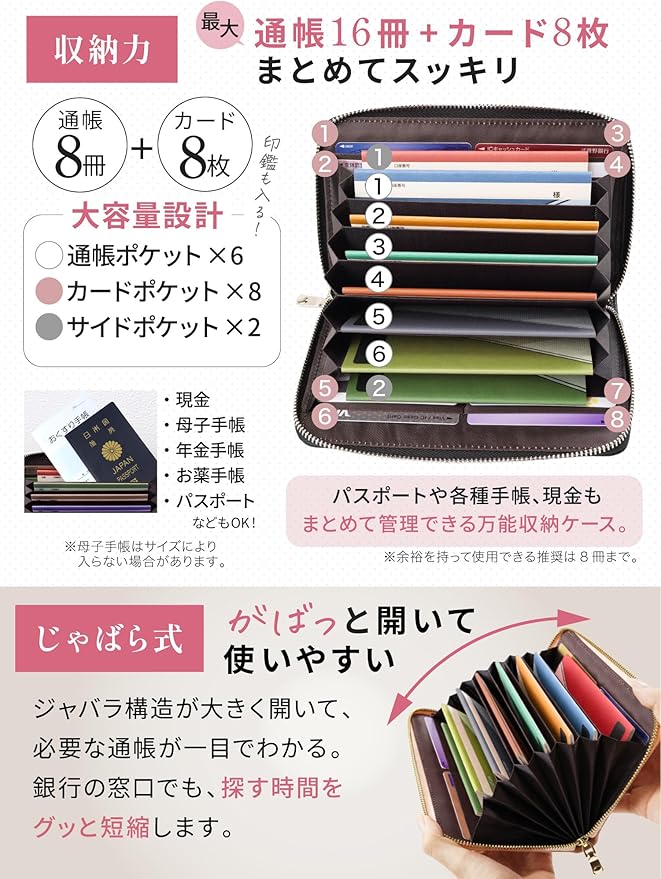 ✅【通帳16冊・カード8枚が入る驚異の収納力】 増えがちな通帳やカードもたっぷりはいる大容量設計 。180度開閉式で、通帳最大16冊に加え、印鑑、お薬手帳、パスポートまで一括管理 。どこに何があるか一目瞭然になり、通帳管理の効率が劇的に向上します。