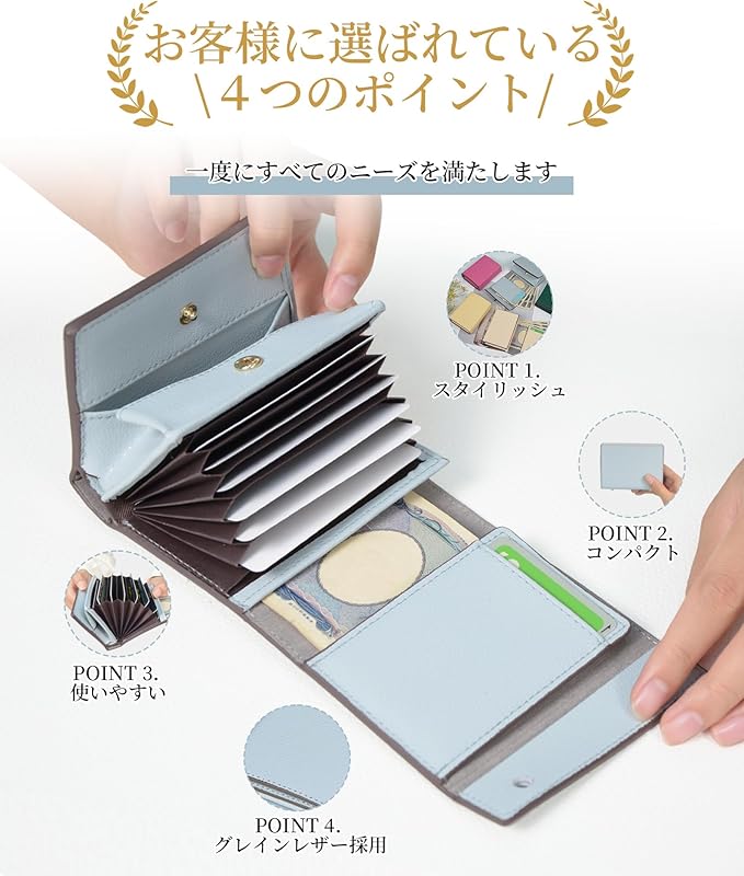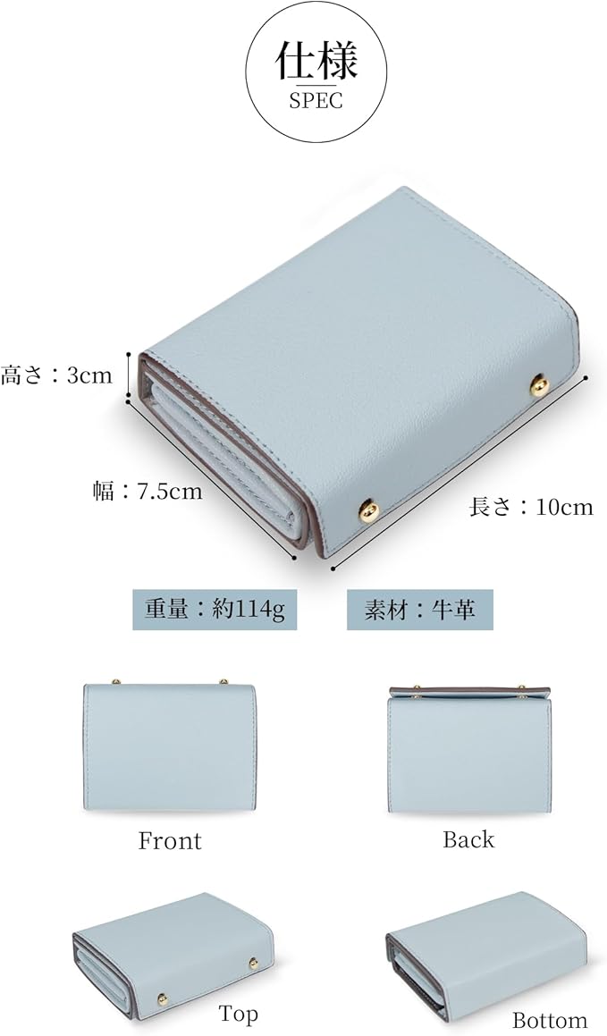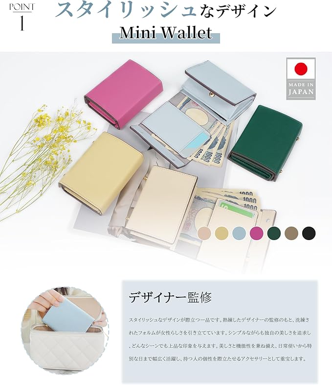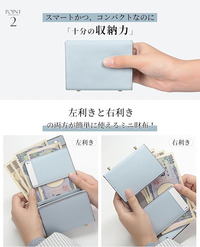 「使いやすいミニ財布」使いやすさを徹底的に考えた設計で、開閉が簡単にできるよう工夫されています。スナップボタンは操作がスムーズで、急いでいるときでもストレスを感じません。じゃばら型カードポケットとボックス小銭入れは使いやすさの鍵、必要なアイテムがすぐに見つかるよう整理されています。日常の忙しいシーンでも、手軽に使えるのが魅力です。
