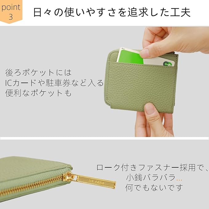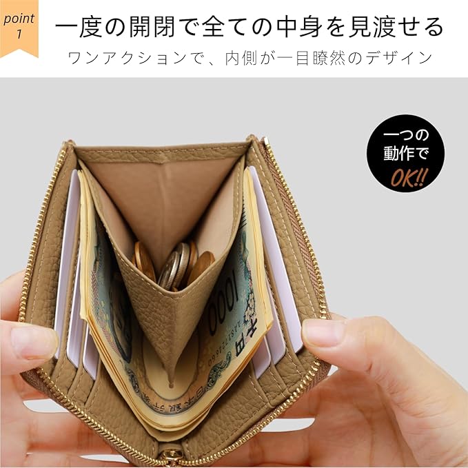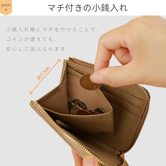 【コンパクトなのに、しっかり収納】 たった手のひらサイズの超コンパクトデザインながら、収納力は十分。 ● 硬貨:最大15枚 ● 紙幣:最大10枚 ● カード類:最大7枚 必要なものをコンパクトにまとめて、すっきりとしたお出かけをサポートします。