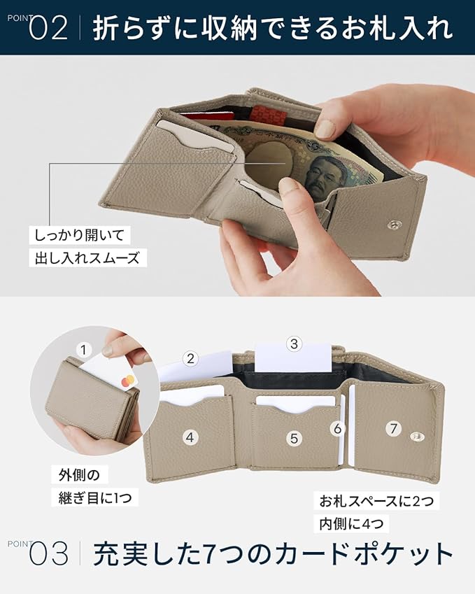 ✅【お札を折らないスマートさ】ミニ財布の弱点を克服 多くのコンパクト財布が抱える「お札を四つ折りにするストレス」を解消しました。 三つ折り構造ながらお札をそのまま差し込める設計で、お会計の際もサッとスマートに取り出すことが可能です。