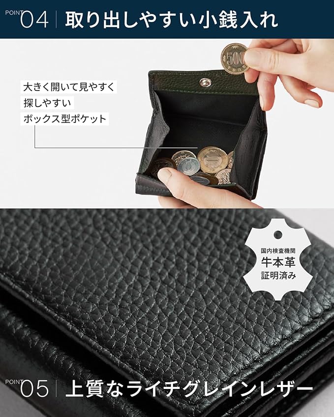 ✅【機能美を支える本革】キズに強いライチグレインレザー 毎日使い込むものだからこそ、国内検査機関にて本革証明を取得済みの耐久性に優れた牛本革を採用しました。 表面に施された繊細なシボ加工(ライチグレインレザー)は、キズや汚れが目立ちにくく、長く愛用できる丈夫さが魅力です。