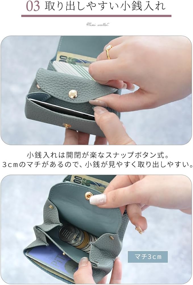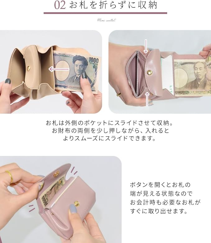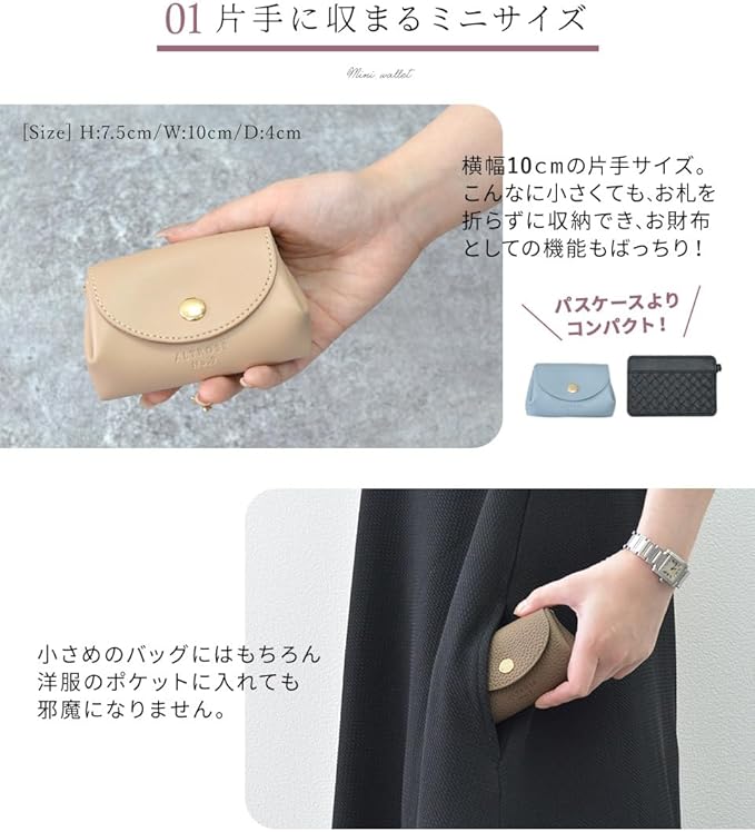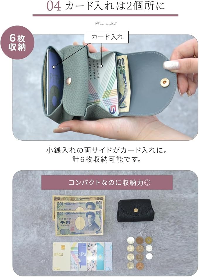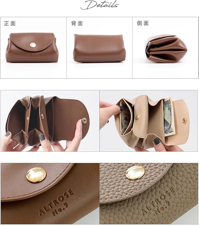 ・小さいのにお札が折れずに収納できるお財布です。・コロンとした小ぶりなサイズ感。・お札は内側両端のポケットに滑り込ませて収納できます。・カードを収納するスペースももちろん完備◎・中央には小銭入れがあります。<br>・トレンドの小さいバッグにも楽々収納できます。・シンプルなデザインなので、年齢問わずお使いいただけます。【ご注意】 ・お客様のモニター環境や、お部屋の照明・日当たり具合などにより、実際のお色味と異なる場合がございます。 ・サイズ・重さは、平置き・メジャー採寸のため、商品ごとに多少の誤差が生じる場合がございます。 ・プリント・型押し加工などの柄物は、裁断位置により一点一点表情の違う仕上がりになります。 ・生産時期により、色・サイズ・デザインが多少異なる場合がございます。 ・製造工程の関係上サイズ感には若干の個体差がございます。アパレル、ストールなどの布製品【約-2cm~+2cm】ニット製品【約-3cm~+3cm】 ※無断での画像の転載などは、禁止しております。