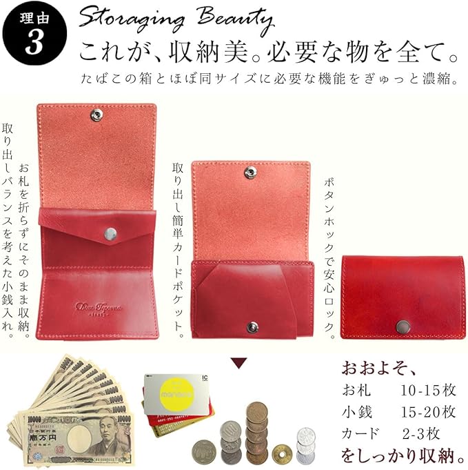 【スペック】札入れ / 小銭入れ / カードケース お札:10〜15枚 小銭:15〜20枚 カード:2〜3枚収納 【素材】 本革 イタリアンレザー 【サイズ】 幅:約9cm 高さ:約6cm 厚み:約2.7~3.5cm プレゼント としても便利な専用化粧箱に入れてお送りします。
