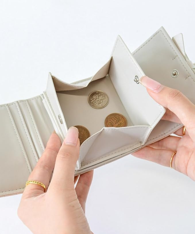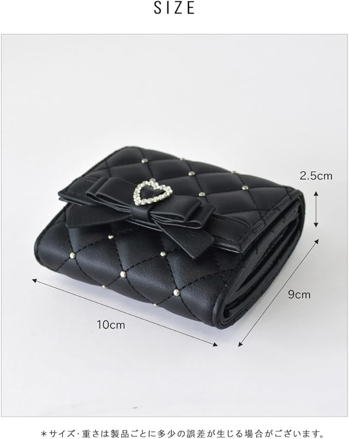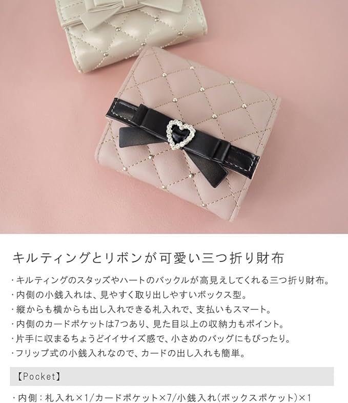・キルティングのスタッズやハートのバックルが高見えしてくれる三つ折り財布。・内側の小銭入れは、見やすく取り出しやすいボックス型。・縦からも横からも出し入れできる札入れで、支払いもスマート。・内側のカードポケットは7つあり、見た目以上の収納力もポイント。・片手に収まるちょうどイイサイズ感で、小さめのバッグにもぴったり。・フリップ式の小銭入れなので、カードの出し入れも簡単。・デイリー使いから旅行やちょっとしたお出かけに大活躍◎