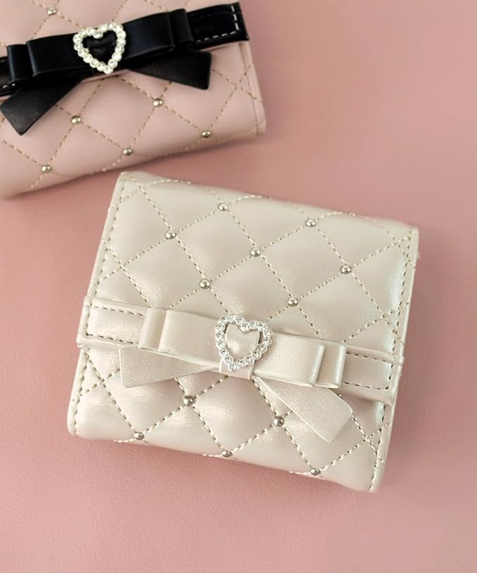スタイル カジュアル カードケース パール キルティング ビジュー リボン ハート シンプル 御洒落 フォーマル ミニ 財布 ミニウォレット 軽い 折りたたみ