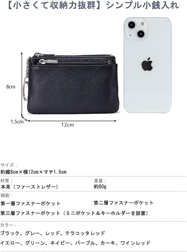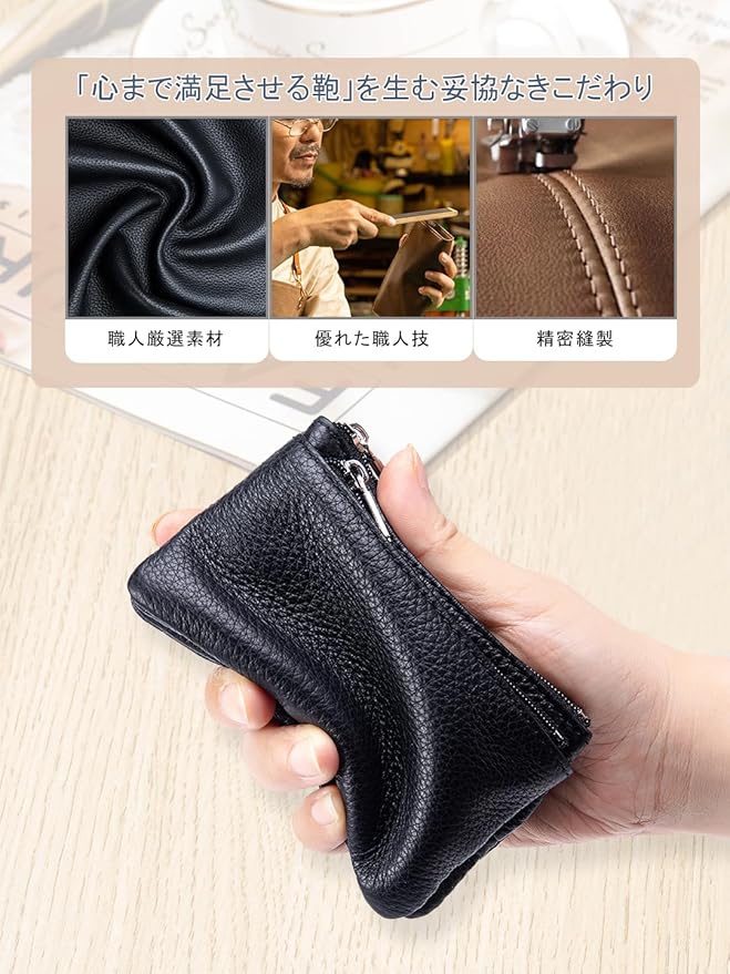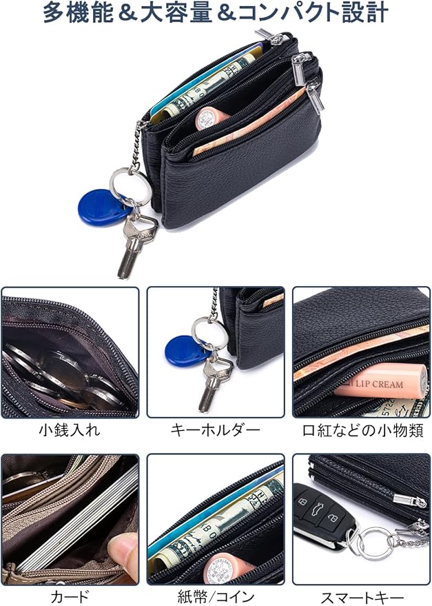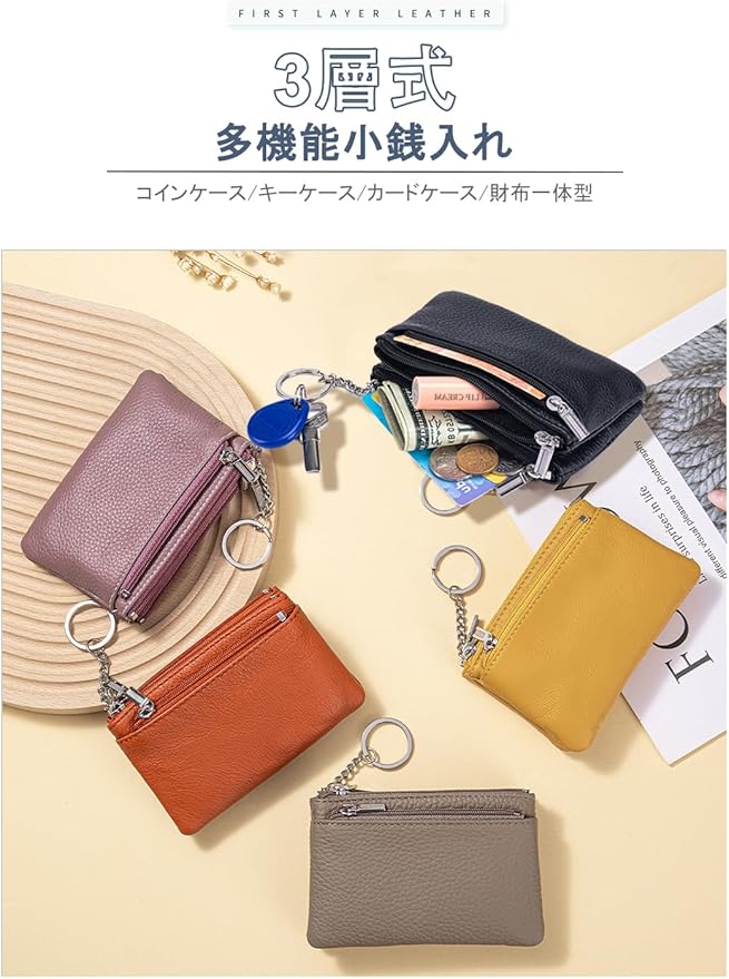【多機能デザイン:コインケース・カードケース・キーケース・ミニ財布一体型】「3層式多機能小銭入れ」は、コイン・カード・現金・鍵を一元管理できる革新的なデザイン。3層のファスナーポケット仕様で、その第3層目の内側にはさらにファスナーポケットとキーホルダーが付いています。