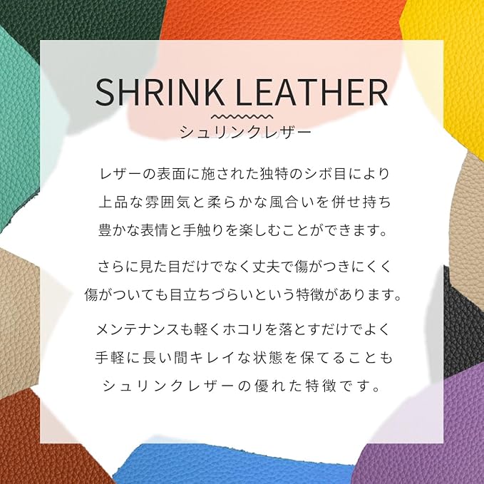 【上品なシュリンクレザー製】 シボ目独特の高級感が魅力の本革、シュリンクレザーを使用しています。 傷が付きにくく、風合いを楽しみながら長くお使いいただけます。