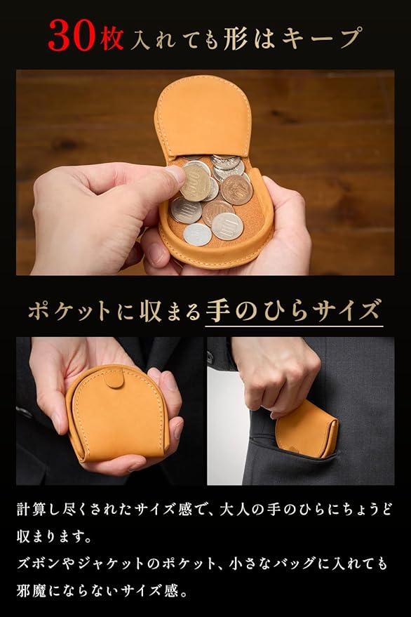 【常識を覆す 30枚収納 設計】手ぶら派の極上ギア ポケットに収まる手のひらサイズ:約8cm (幅) 約8cm (高さ) 約1.8cm (厚さ)、重さわずか約30gの超軽量設計。 ノーストレスな携帯性を実現:ズボンやジャケットのポケット、小さなバッグに入れても一切邪魔にならない、 計算し尽くされたサイズ感です。極小にして大容量:この極小サイズながら、小銭30枚を入れても美しい馬蹄型のフォルムをしっかりキープします。