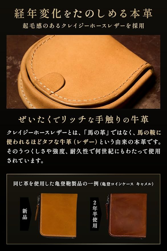 【所有する喜びと高い耐久性】 贅沢なクレイジーホースレザー採用: 馬具にも使われるほどタフで丈夫な牛本革を使用。リッチな手触りをお楽しみください。 使い込むほど美しくなる: 使えば使うほど色艶が増し、深みのあるアンティーク調の風合いに育つため、長く愛用するほど愛着が深まります。