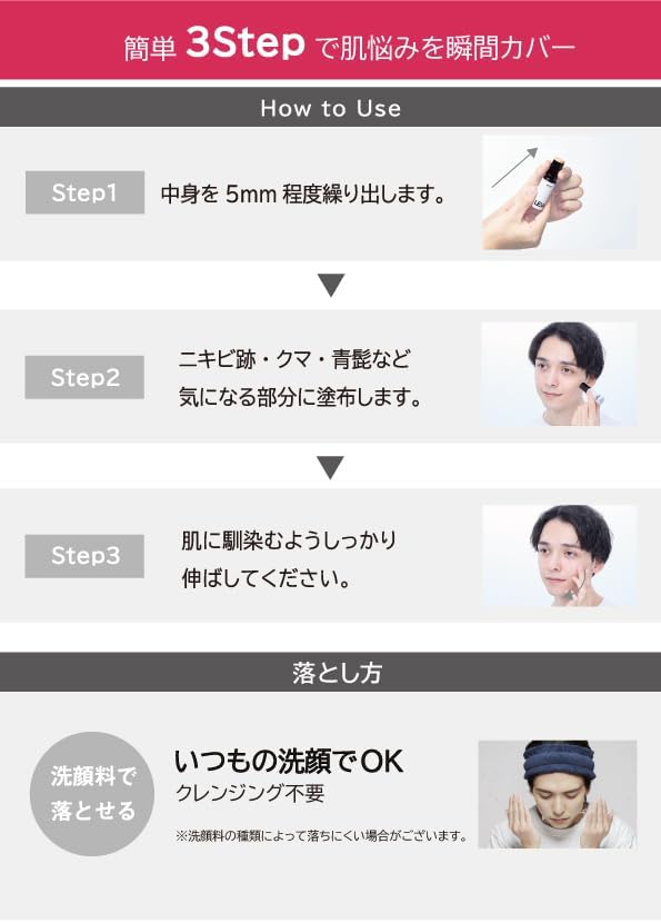 商品特長 簡単に肌悩みを隠す 毛穴 ニキビ跡 クマ 青髭 肌色 好印象な顔に仕上げる スティックタイプで直接塗るだけ ナチュラルな仕上がり 洗顔料で落とせる SPF47PA++++