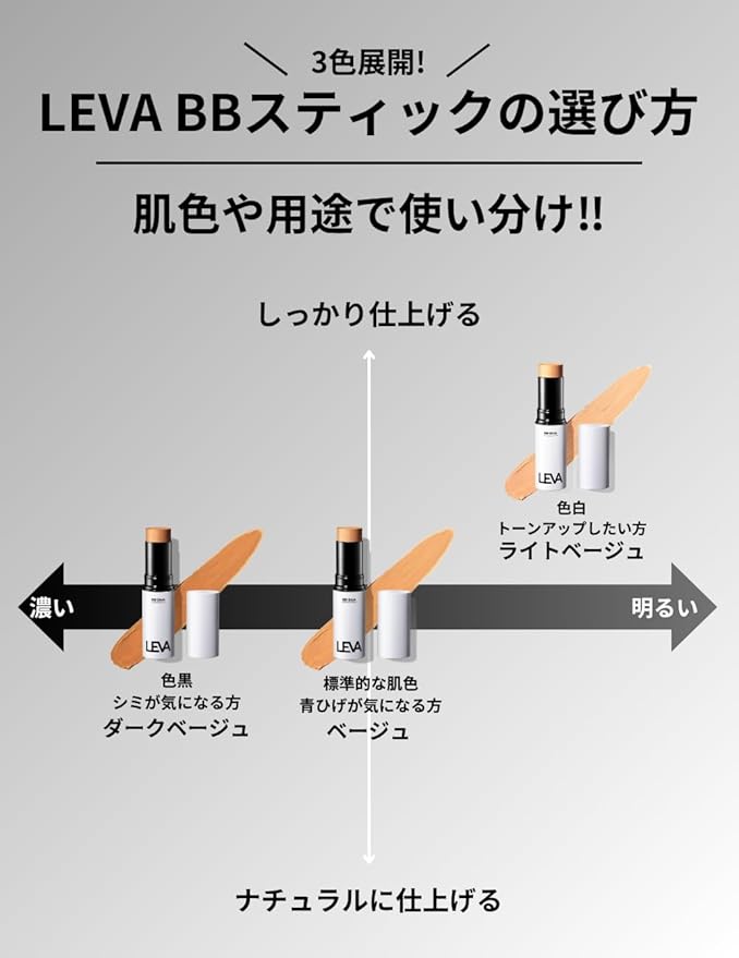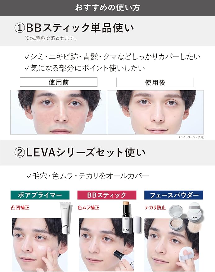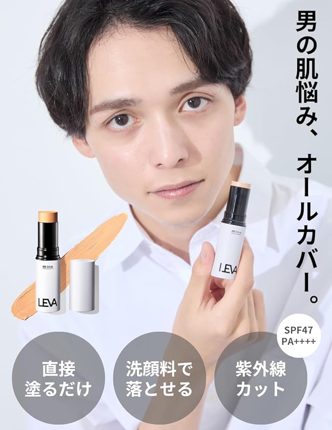 LEVA(レヴァ) BBスティック ベージュ簡単 悩みカバー メイク初心者 時短 テクニック不要 直接塗るだけ (クマ 毛穴 ニキビ跡 青ひげ 肌色補正) SPF47 PA++++ 就活の身だしなみ 洗顔料で落とせる メンズbb