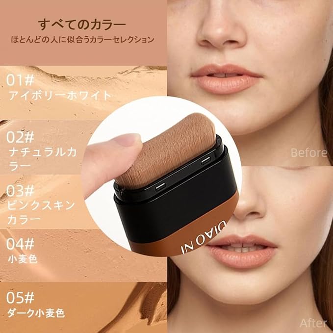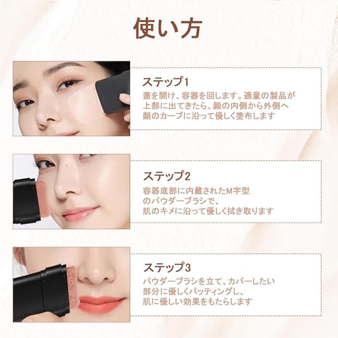 【時短・簡単オールインワン】: 回す→塗る→叩くの簡単操作。煩わしい道具やスキル不要で、肌に負担をかけず自由な呼吸を確保。コンパクトサイズで携帯に便利、外出先のサッとメイク直しや旅行にも最適。