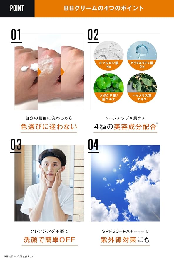 商品の推奨用途 ひと塗りで肌のトーンや印象をナチュラルに整えるメンズBBクリーム。気になる毛穴や赤みをしっかりカバーしながら、自分の肌色に馴染むので塗りバレしにくい自然な仕上がりに。日焼け止めとしても使える便利な2in1アイテムで、忙しい朝もこれ1本でOK。洗顔で簡単にオフできるので、毎日手軽に清潔感をキープできます。ひと塗りで肌のトーンや印象をナチュラルに整えるメンズBBクリ… 表示を増やす