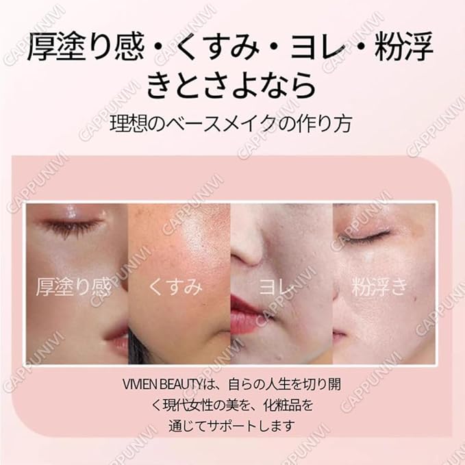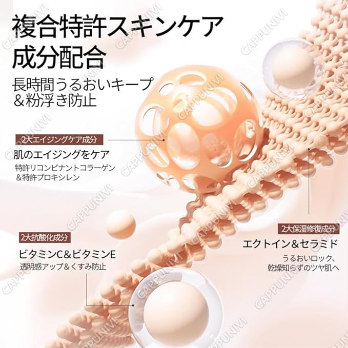 自然素肌感:シミ・色ムラ・毛穴をしっかりカバーしつつ,厚塗り感・くすみ・ヨレ・粉浮きを解消,均一で透明感のある素肌メイクを実現。
