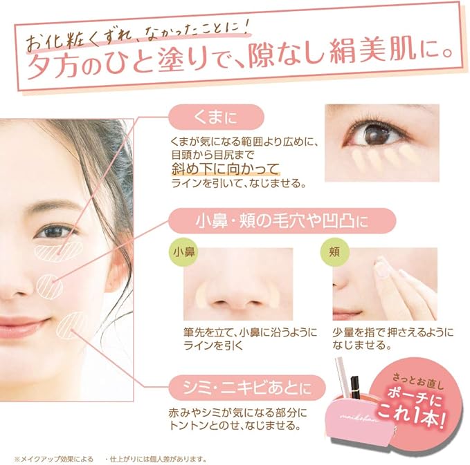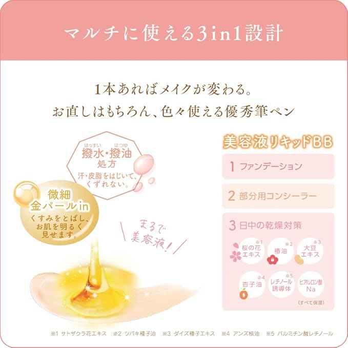 さっとお直し筆ペンBB。筆技1本。瞬間、隙なし絹美肌。コンシーラー級カバー+高密着薄膜仕立て。マルチに使える3in1設計(1ファンデーション、2部分用コンシーラー、3日中の乾燥対策)SPF+PA++++。美容液リキッドBB。