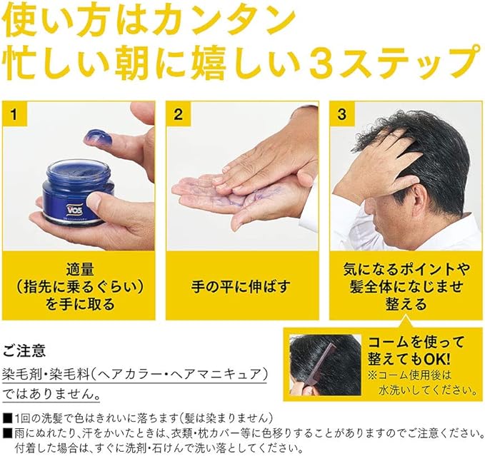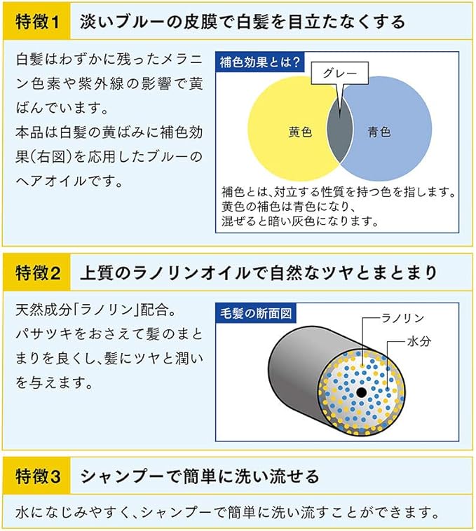 ●白髪を目立たなくする白髪染め●ツヤを与える整髪料●染毛に抵抗がある方に●黄ばみを目立たなくするヘアスタイリング剤
