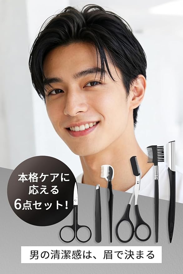 【男の第一印象を左右&眉毛メイクセット】優しい雰囲気、クールな印象、メガネに合わせた眉スタイル… これ1つで全てが揃うメンズ専用眉毛ケアセットです。眉毛ハサミ、クシ付きハサミ、ブラシ、カミソリ、精修カミソリ、毛抜きがセットになっているので、1点で完璧にスタートできます。