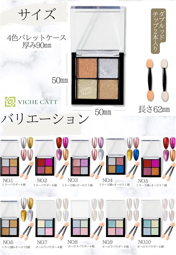 メタリック感のあるミラーパウダーが4色セットになって1つのパレットに! どれも使用頻度の高い人気カラーで、色鮮やかで綺麗な発色が楽しめます。 ミラー感とメタリック感を演出でき、シンプルなジェルネイルもいつもと違った仕上がりに! ビジューなども併用すればデザインは無限大!初心者にもプロにも扱いやすく飛び散りにくいのも特徴です。 10種のラインナップからお好きなテイストに合わせてセレクトください。