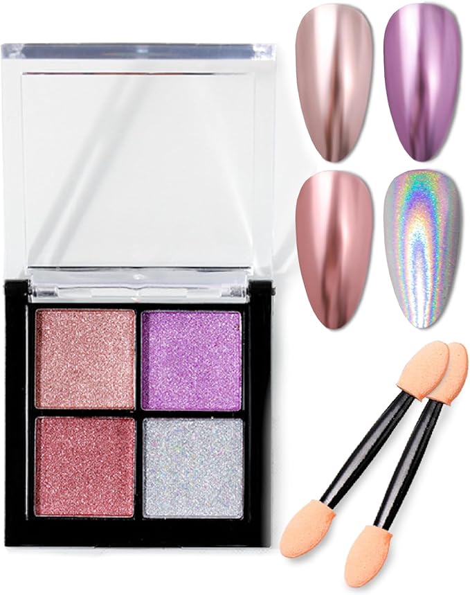 固形タイプのネイルパウダーのため飛び散りにくく、ひっくり返してもこぼれないコンパクトで持ち運びにも便利です。 極細な微粒子がとても上品な輝きを放ち、シンプルなネイルも一気に手元が華やかに早変わり! 着色と塗布が簡単で塗りやすく、ネイル初心者でも簡単にパウダーを爪の表面に均一に塗ることができ優れた発色を実現! 4色それぞれに使用できるよう2本のダブルヘッドチップが同梱されています。