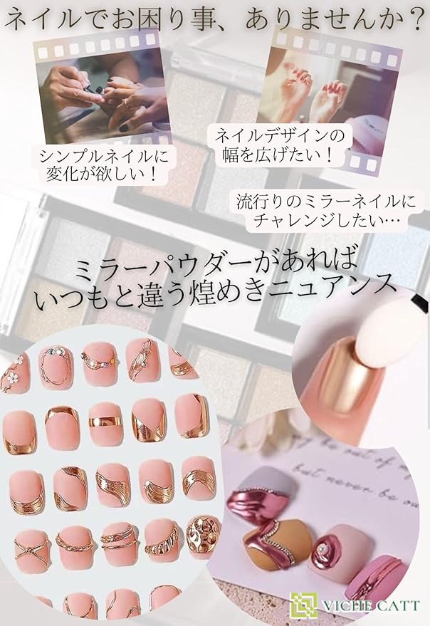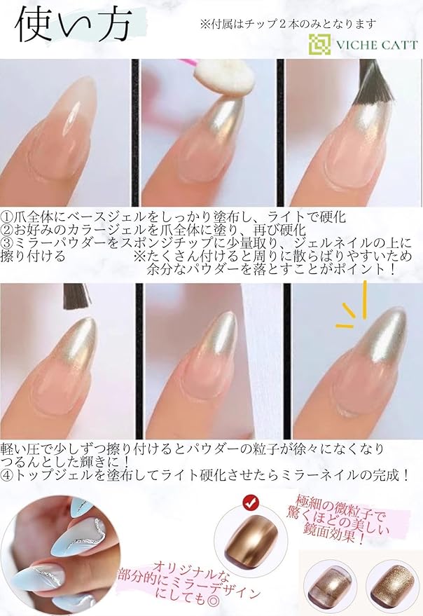 ミラーパウダーを使用するだけで驚くべき鏡面効果で幻想的な仕上がり! 厳選された4色で組合せも楽しいです。 使い方はとても簡単↓ 細かい微粒子を付属のチップでパウダーを爪にこすりつけるだけで綺麗なミラーネイルが完成。 ノンワイプトップジェルを使ってオリジナルデザインを作ったり、全面に付けて爪全体をミラーネイルにしたり部分的にミラーデザインにしても◎ 無限大に創作デザインが楽しめます。