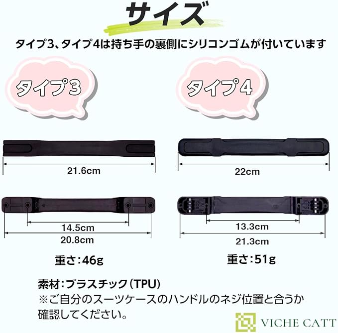 サイズ(全長 内穴ピッチ 外穴ピッチ、重さ):タイプ1(21.3cm 10.7cm 19.5cm、78g)タイプ2(20.2cm 12.3cm 19cm、63g)タイプ3(21.6cm 14.5cm 20.8cm、46g)タイプ4(22cm 13.3cm 21.3cm、51g)素材:プラスチック(TPU)※タイプ3とタイプ4の持ち手の裏側にはシリコンゴムが付いています。※ネジは付属しておりません。 いろいろなタイプのハンドルがありますが、ご自分のスーツケースのハンドルのネジ位置と合うかご購入前に確認して下さい。