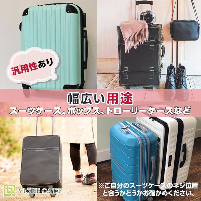 この商品は幅広い用途に使用できます。多くの限定商品のスーツケースに適合します。スーツケースのほか、持ち手が取り外し可能な一般的な旅行用のバッグやリュックサック、持ち手がネジで取り付けられるような工具箱や収納ボックス、取り外し可能な持ち手があるツールキットや機材を収納するキャリーケースなどもサイズが合えば取り付け可能です。