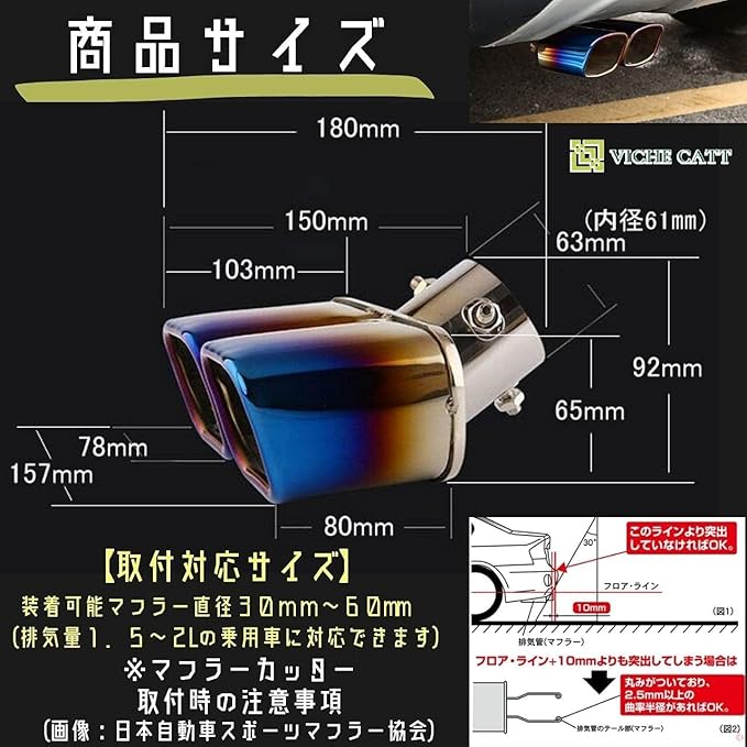 【注意事項】取付対応サイズ 装着可能マフラー取付部分サイズ →30㎜Φ~60mmΦ 排気量制限→1.5-2.0Lの乗用車に対応できます。これ以上の排気量車種は適合不可となります。汎用タイプなので取付直径、バンパーの干渉などが問題なければ取付可能です。取り付け部分の詳細のサイズをしっかりと事前に確認の上ご購入の程宜しくお願い致します。サイズが合わない場合は取り付けが出来ませんのでご注意の程宜しくお願い致します。その他事前にサイズの確認をしないと想定のイメージと違う場合がございますのでしっかりとご確認の上ご購入の程宜しお願い致します。しっかり締め付ければ脱落リスクは減りますが、心配な場合は別途脱落防止ワイヤーをご用意ください。またプリウスシリーズに関しては不適合となります。ご注意の程宜しくお願致します。【パッケージ内容】 デュアルマフラーカッター1個 【サイズ】約190x158mm 【入口内径】63mm 【重量】473g 【素材】最高の耐久性を実現する高強度ステンレス鋼製