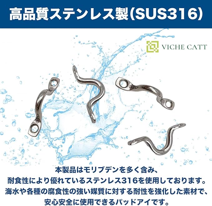 高品質ステンレス製(SUS316) 本製品はモリブデンを多く含み、耐食性により優れているステンレス316 を使用しております。海水など各種の腐食性の強い媒質に対する耐性を強化した素材で、安心安全に使用できるパッドアイです。