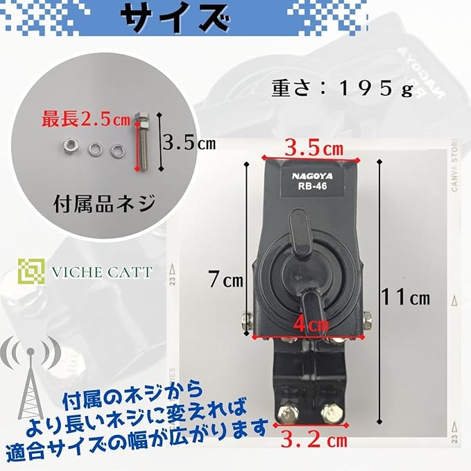基台の大きさとしては、比較的小さめで、かつ軽量なのもうれしいポイントになっています。 付属品のネジの長さは、ナットを付けて25mmとなっています。 25mmまでとやや短めの箇所となりますが、長いネジを用意していただき、ご自分で変えることで、より幅広い場所にも対応することができます。 適合サイズの幅が広げられるので、アンテナ基台をつけたい箇所がより多様になるのも、オススメのポイントになっています。