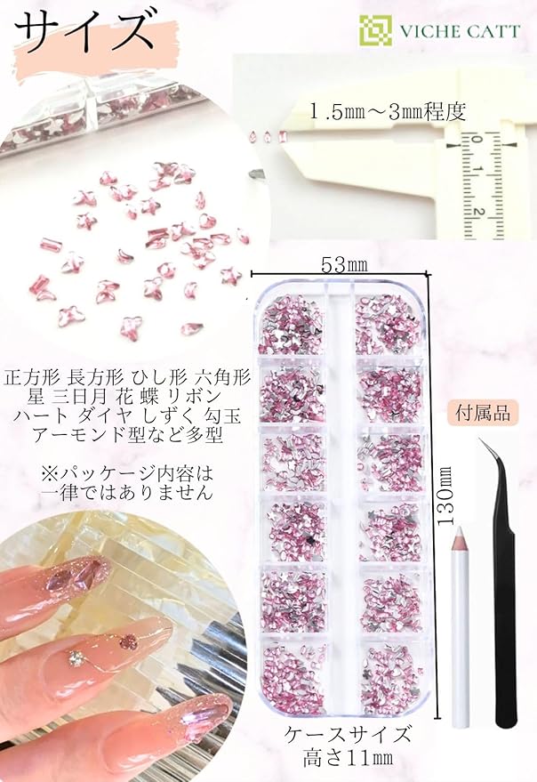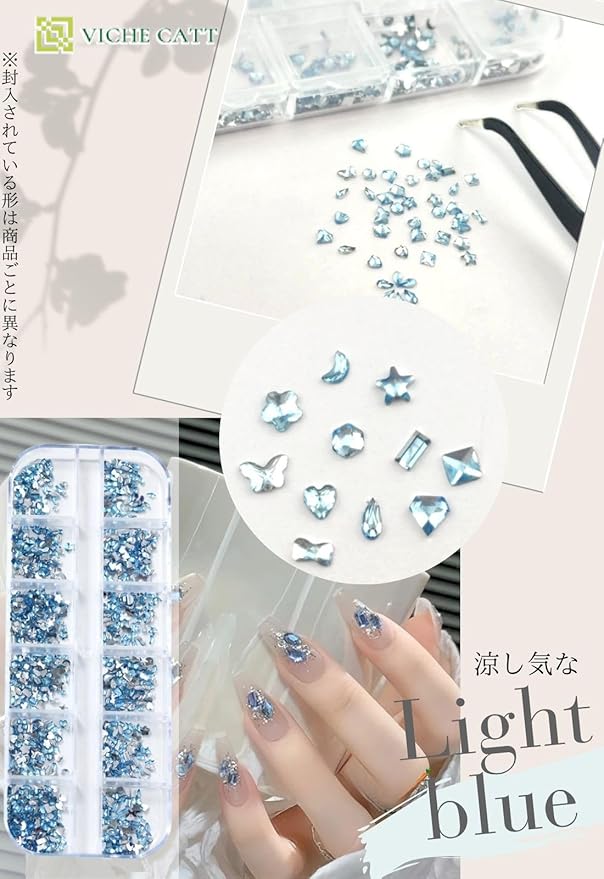 ラインストーンは1.5mmから3mmまでの小サイズ、ケースは仕切りがされているので持ち運びやすく紛失しにくいです。 色んな形がパッケージされているので、想像力豊かにより個性的なデコレーションが楽しめます。種類は 涼し気なライトブルー、癒しカラーのライトグリーン、キュートなピンク、オシャレなパープル、万能色シルバー、煌きが豪華なシルバー+シャンパン、カラフルに楽しめるミックス+シルバーの7バリ。