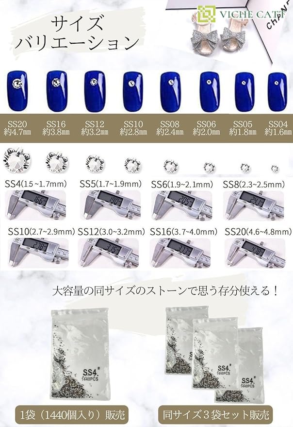 高品質のラインストーン、透明感ある輝きでキラキラと光り、ネイルアートや小物のデコパーツにピッタリ! サイズバリエーションは豊富に8種の大きさがラインナップ お好みやアイテム、シーンに合わせて楽しむことができます。 同サイズのストーンが1袋になんと1440個入り、お得でうれしい大容量パッケージです! 1袋販売、お買い得な3袋販売からお選びいただき、デコレーションを思う存分楽しむことができます。