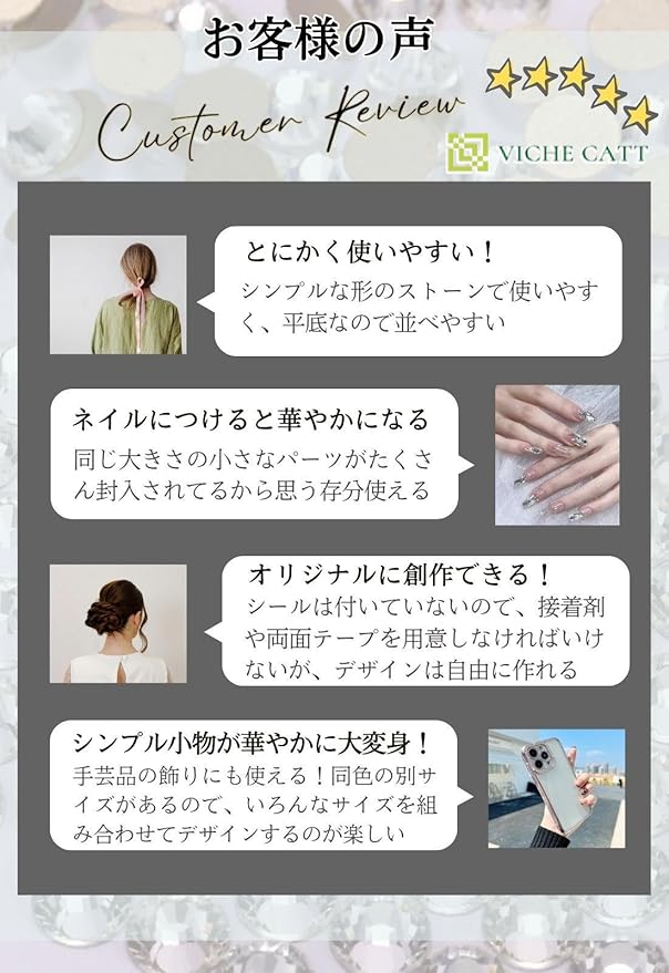 フラットバッククリスタルストーンで美しいカッティングラインが魅力です。 使い方は簡単! 裏面が平らになっているので、ボンド等で貼り付けデコレーションし乾くまで待つだけ。フラットなので付けやすく初心者の方も安心です。 8サイズ展開で1袋販売、お得な大容量3袋販売から用途に合わせてセレクトください。