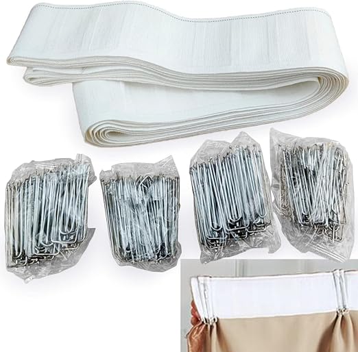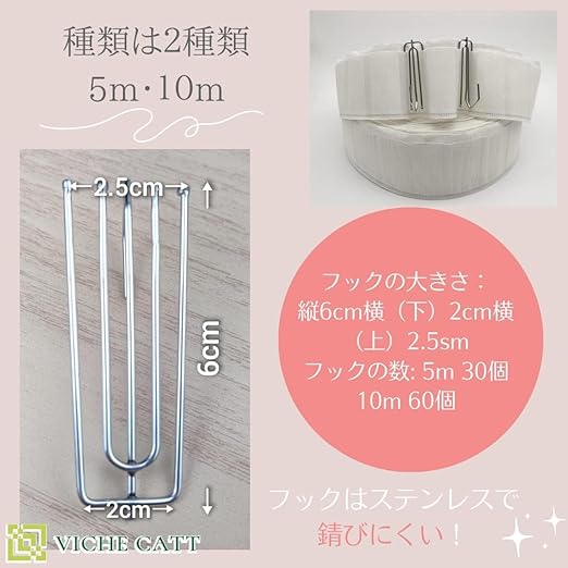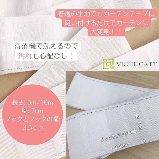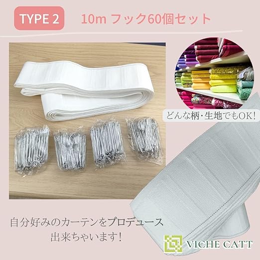 VICHE CATT カーテン テープ フック付き 手作り用 ホワイト (10m(フック60個))