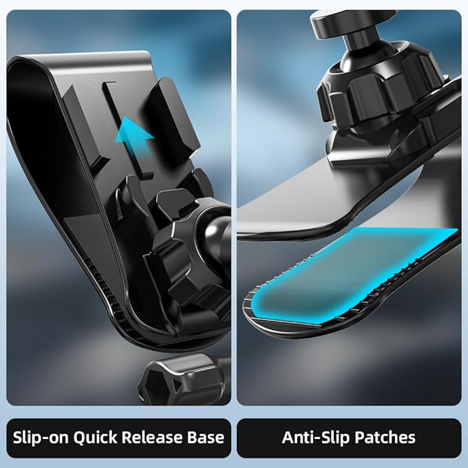 優れた滑り止め性能—撮影中の振動や落下を防ぐために、接触面の摩擦を増加させるためにクリップの口で上げられたデザインの車のタブレットマウントサンバイザー。