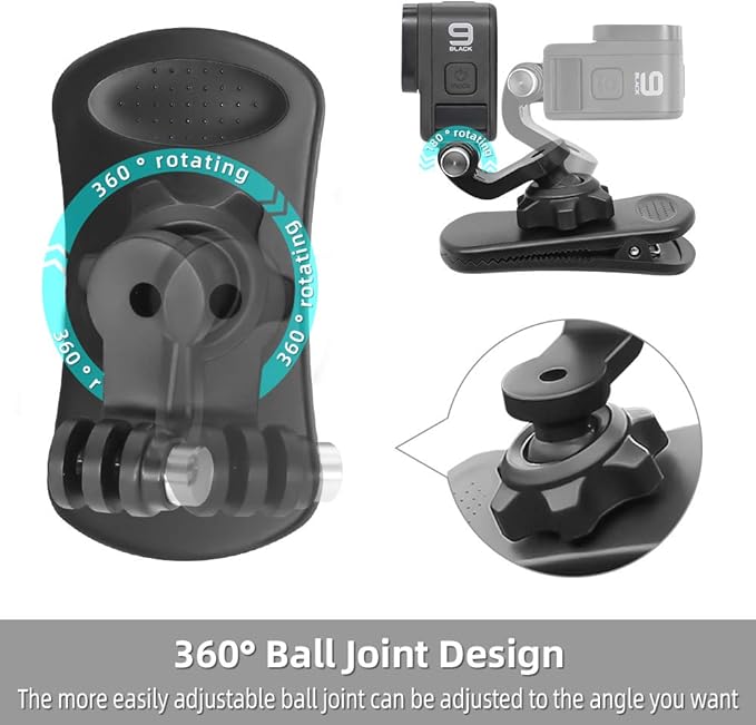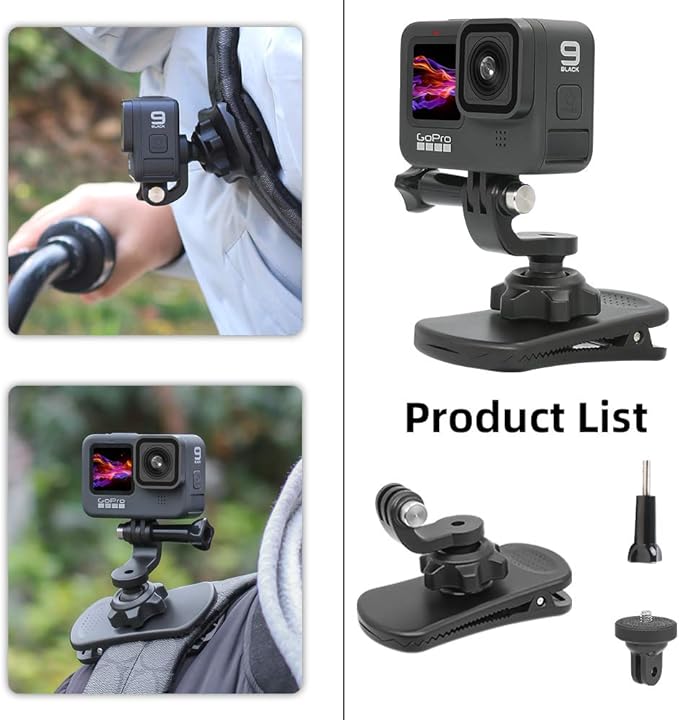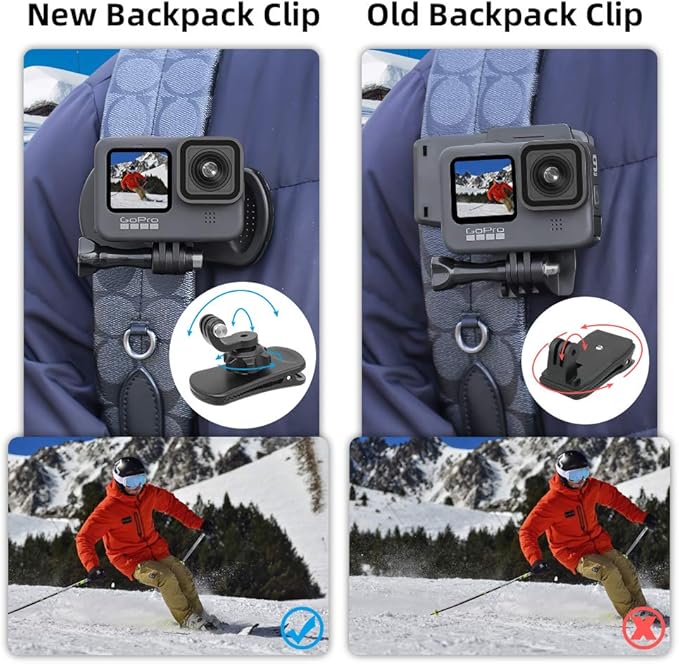 【新しいバックパッククリップマウント】 - ボールジョイント設計により、360 の角度調整を素早く実現できます。左右および上下にも調整可能で、旧型のバックパッククリップではできない機能です。撮影角度を簡単に調整し、横撮りと縦撮りを実現します。
