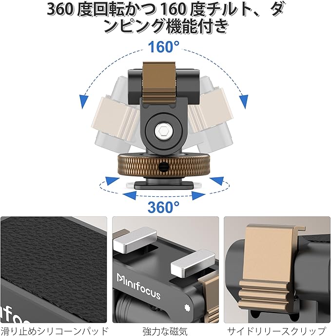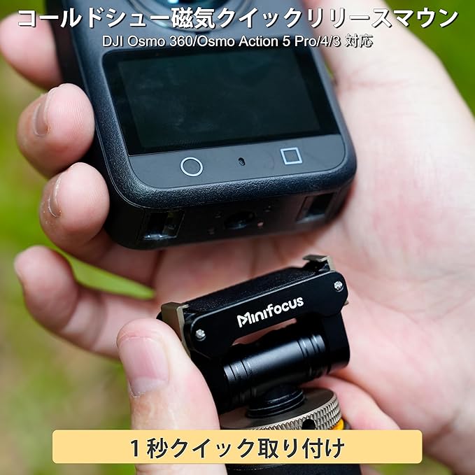 MINIFOCUS コールドシューアクションカメラ用マグネットクイックリリースマウントホルダー、160度チルト&360度回転調整可能、ユニバーサルカメラアダプター(1/4インチネジ穴付き)Osmo 360 / Action 5 Pro / 4 / 3 対応