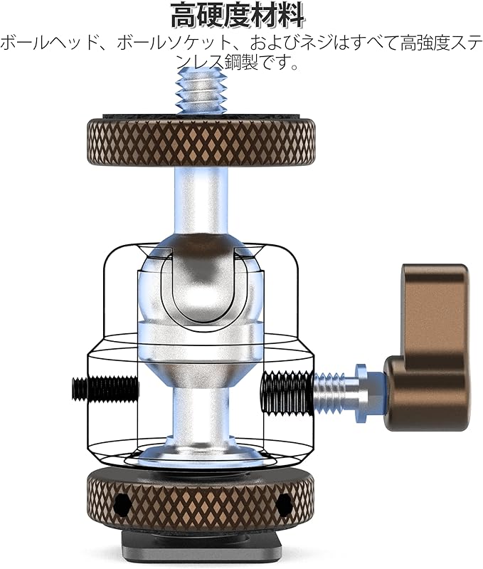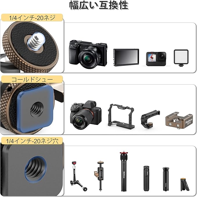 対応デバイス LEDビデオライト、スマートフォンホルダー、フィールドモニター、マイク、その他1/4インチネジ穴付きアクセサリー
