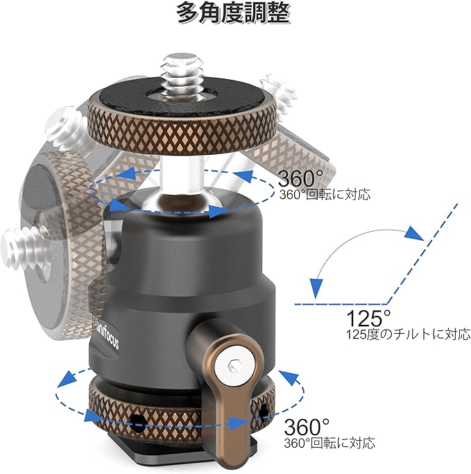 多角度対応:360 パノラマ回転。125 チルト回転。ボールヘッド直径約18mm。ロックノブで簡単に固定でき、様々な撮影角度に対応。