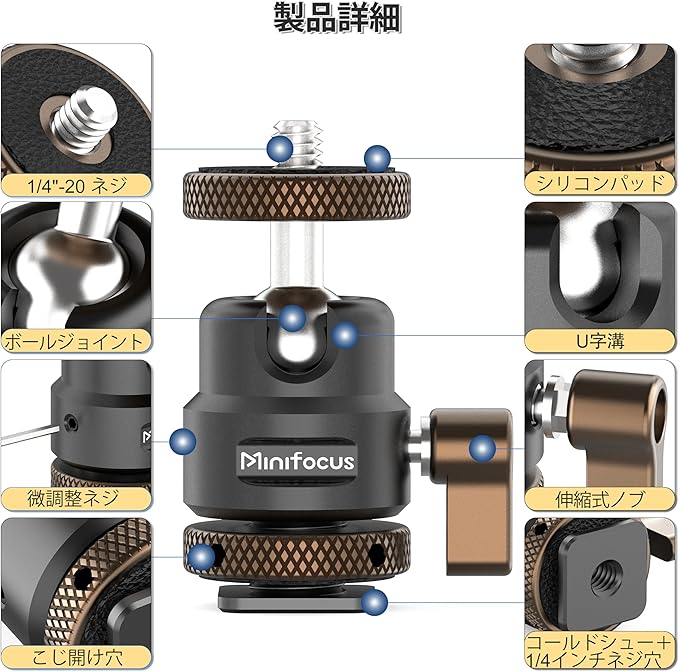 MINIFOCUS ミニボールヘッド、金属製三脚ボールヘッド(1/4インチコールドシューアダプター付属)、カメラ・ビデオカメラ・スマートフォンホルダー用360度回転ボールヘッド、最大負荷11ポンド(約5kg)