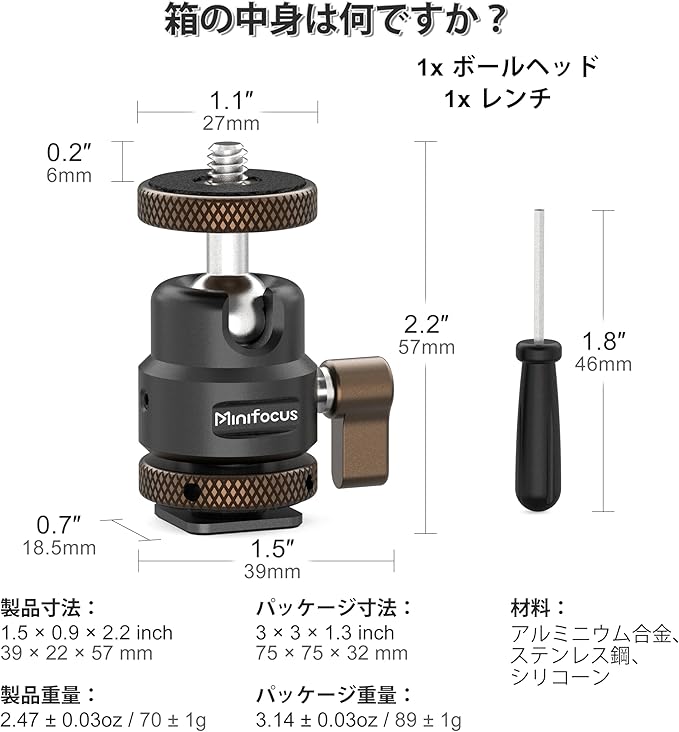 軽量&携帯性:重量:2.4オンス/69.4g、サイズ:1.6インチ 2.0インチ 1.2インチ/40 50 30mm。コンパクト設計で持ち運びに便利。パッケージ内容:ミニボールヘッド 1、レンチ 1。
