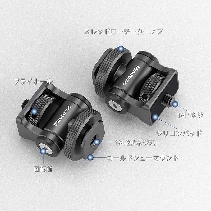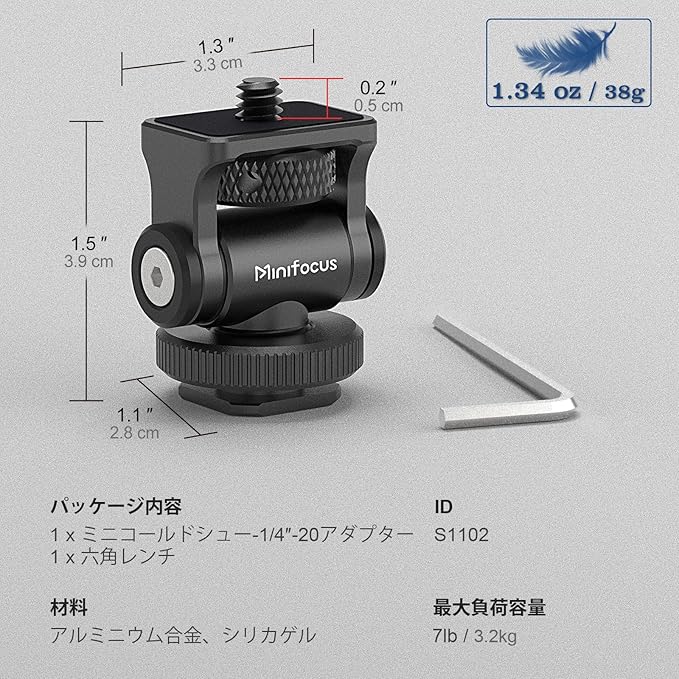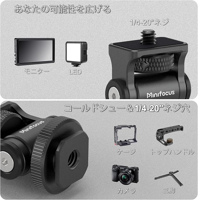 対応デバイス 5インチおよび7インチモニター、LEDライト、その他1/4インチネジ穴/ネジ付きカメラアクセサリー、カメラケージ、トップハンドル、カメラ、その他コールドシュー付きアクセサリー