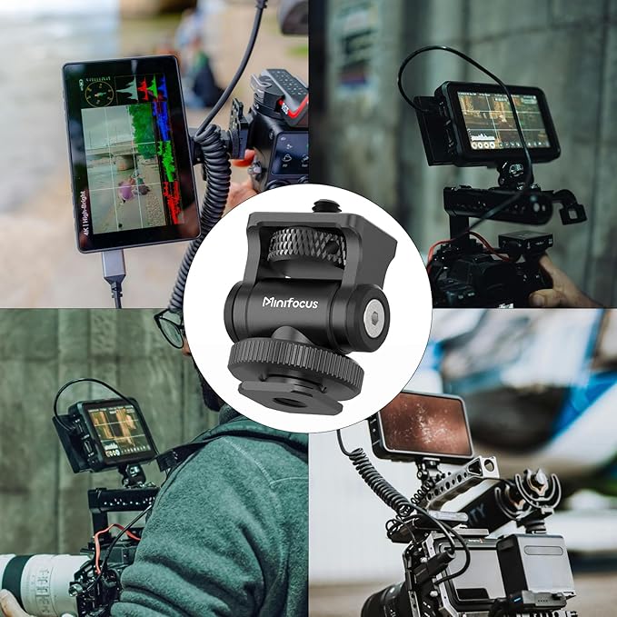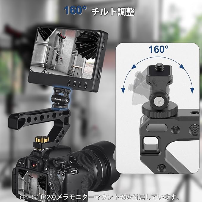 強力なモニターマウント: モニターマウントは、コールドシューアダプターを介してカメラの上部または他のマウントシステムにモニターを取り付けるように設計されており、追加の機器を必要とせずに軽量設計を実現しています